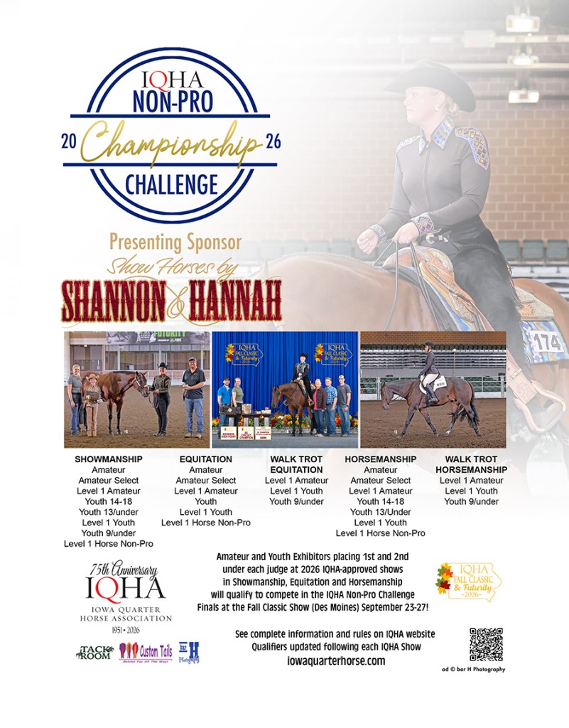 The first and second place exhibitors under each judge of these classes, held at IQHA-approved 2025 shows, will be invited to compete in the Challenge Finals held during the IQHA Fall Classic & Futurity Show in September. Qualifying shows in 2025 will include: Snowflake Circuit, Mayflower, Denison show, Scenic City Summer Show, Hawkeye Classic and Fall Classic (each showmanship, equitation and horsemanship held). *Note All-Breed classes are not included